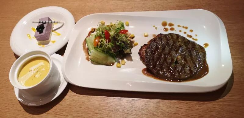 黑椒牛扒+香酥薯饼+玉米浓汤+时蔬沙拉+蓝莓慕斯蛋糕