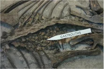 我们的牙齿结构简单,无法咀嚼食物。我们像“撸串”一样用牙齿将蕨类和针叶树的枝叶刮下来,囫囵吞枣地卷入腹中。为了帮助消化,我们会吞食许多石块帮助磨碎吞下的植物。所以那些古生物考古学家常常会在我们的化石腹腔处发现一些由于反复摩擦和胃酸的腐蚀变得像鹅卵石一样光滑的石块,他们管这些石块叫做胃石。